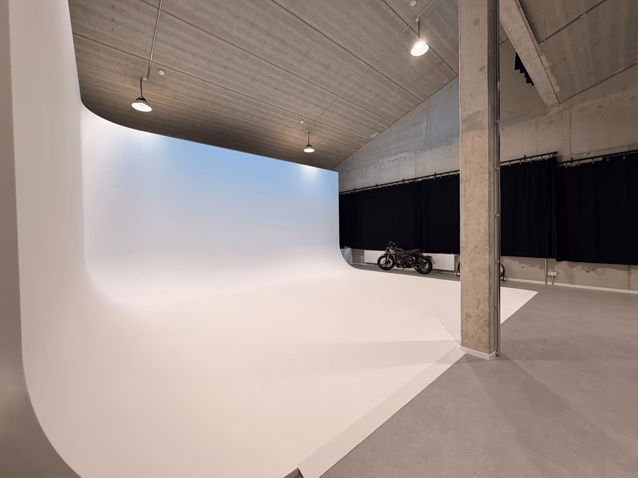 Unser Produktions-Flagship: Eine über 100 m² große L-förmige Hohlkehle mit 3,80 m Höhe – perfekt für Foto-, Video- und Setbau.
